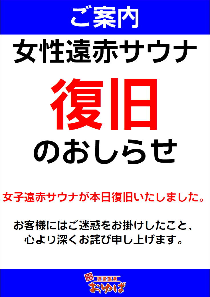 八尾おゆば女子遠赤サウナ復旧のおしらせ