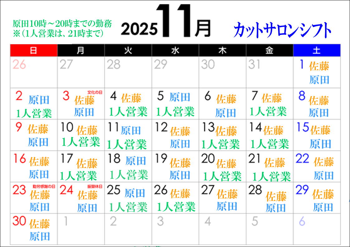 八尾おゆば11月 カットサロンシフト