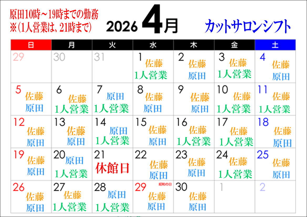 2月より、スタッフ「原田」の勤務時間が10時~19時に変更致します。